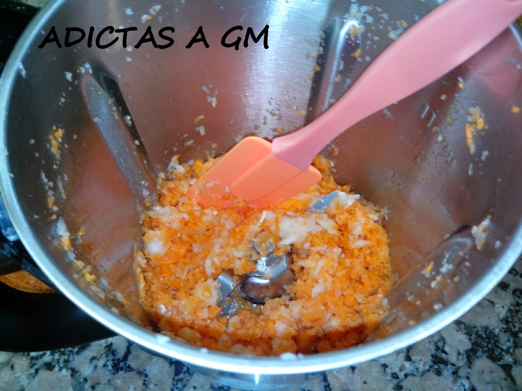 Pelamos la cebolla, el ajo y las dos zanahorias, las cortamos a trozos, las ponemos dentro de la cecomix.